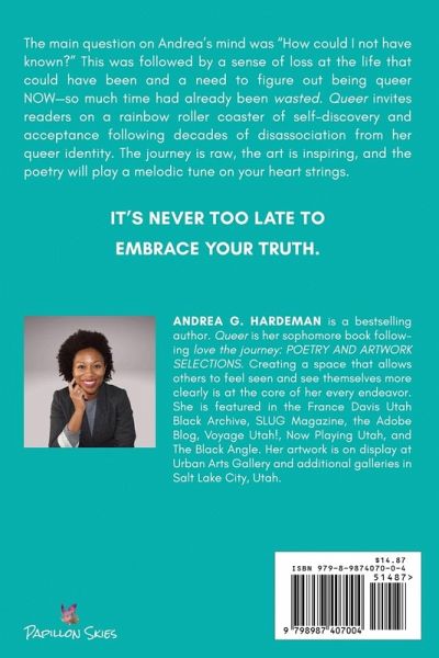 The main question on Andrea's mind was "How could I not have known?" This was followed by a sense of loss at the life that could have been and a need to figure out being queer NOW-so much time had already been wasted. Queer invites readers on a rainbow roller coaster of self-discovery and acceptance following decades of disassociation from her queer identity. The journey is raw, the art is inspiring, and the poetry will play a melodic tune on your heart strings. It's never too late to embrace your truth.