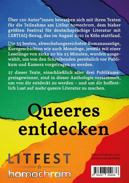 "Queeres entdecken" bietet ein Panorama aktueller, ausgewählt guter queerer Literatur.Über 120 Autor_innen bewarben sich mit ihren Texten für die Teilnahme am Litfest homochrom, dem bisher größten Festival für deutschsprachige Literatur mit LSBTIAQ-Bezug, welches im August 2021 erstmals in Köln stattfand.Die 33 besten, abwechslungsreichsten Romanauszüge, Kurzgeschichten wie auch Monologe, jeweils mit einer Leselänge von zirka 20 bis 25 Minuten, wurden ausgewählt, um von den Schreibenden persönlich vor Publikum und Kamera vorgetragen zu werden.27 dieser Texte, einschließlich aller drei Publikumspreisgewinner, sind in dieser Anthologie versammelt, um von dir entdeckt zu werden - und um dir hoffentlich Lust auf mehr queere Literatur zu machen.