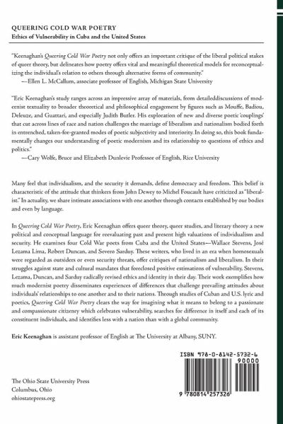 Many feel that individualism, and the security it demands, define democracy and freedom. This belief is characteristic of the attitude that thinkers from John Dewey to Michel Foucault have criticized as "liberalist." In actuality, we share intimate associations with one another through contacts established by our bodies and even by language. In Queering Cold War Poetry, Eric Keenaghan offers queer theory, queer studies, and literary theory a new political and conceptual language for reevaluating past and present high valuations of individualism and security. He examines four Cold War poets from Cuba and the United States-Wallace Stevens, José Lezama Lima, Robert Duncan, and Severo Sarduy. These writers, who lived in an era when homosexuals were regarded as outsiders or even security threats, offer critiques of nationalism and liberalism. In their struggles against state and cultural mandates that foreclosed positive estimations of vulnerability, Stevens, Lezama, Duncan, and Sarduy radically revised ethics and identity in their day. Their work exemplifies how much modernist poetry disseminates experiences of differences that challenge prevailing attitudes about individuals' relationships to one another and to their nations. Through studies of Cuban and U.S. lyric and poetics, Queering Cold War Poetry clears the way for imagining what it means to belong to a passionate and compassionate citizenry which celebrates vulnerability, searches for difference in itself and each of its constituent individuals, and identifies less with a nation than with a global community.