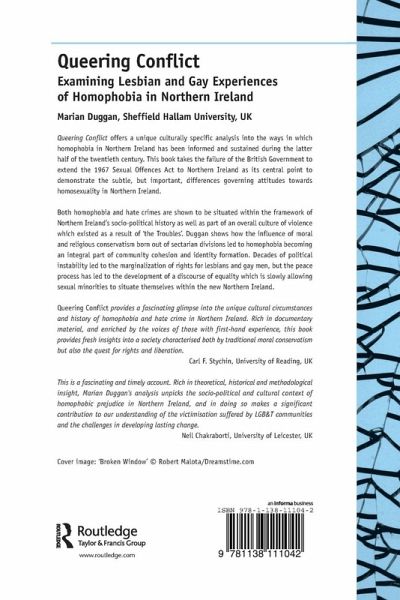 Queering Conflict offers a unique culturally specific analysis into the ways in which homophobia in Northern Ireland has been informed and sustained during the latter half of the twentieth century. This book takes the failure of the British Government to extend the 1967 Sexual Offences Act to Northern Ireland as its central point to demonstrate the subtle, but important, differences governing attitudes towards homosexuality in Northern Ireland. Both homophobia and hate crimes are shown to be situated within the framework of Northern Ireland's socio-political history as well as part of an overall culture of violence which existed as a result of 'the Troubles'. Duggan shows how the influence of moral and religious conservatism born out of sectarian divisions led to homophobia becoming an integral part of community cohesion and identity formation. Decades of political instability led to the marginalization of rights for lesbians and gay men, but the peace process has led to the development of a discourse of equality which is slowly allowing sexual minorities to situate themselves within the new Northern Ireland.