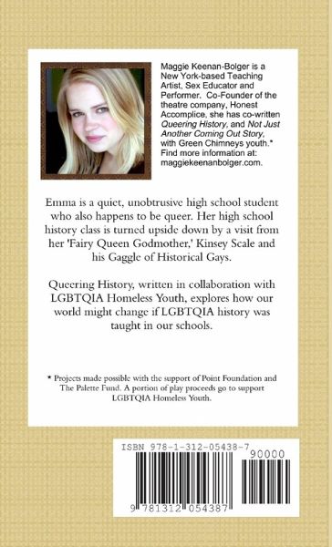 Emma is a quiet, unobtrusive high school student who also happens to be queer. Her high school history class is turned upside down by a visit from her 'Fairy Queen Godmother,' Kinsey Scale and his Gaggle of Historical Gays. Written in collaboration with LGBTQIA Homeless Youth, Queering History explores how our world might be different if LGBTQIA history was taught in our schools. A multi-character play for ages 14 and up, Queering History is the perfect script for a high school theatre program, a Gay/Straight Alliance, audition monologues for youth, or for any young person frustrated by the lack of LGBTQIA history taught in their schools. A version for High Schools is also available, just search "Queering History: High School Version"