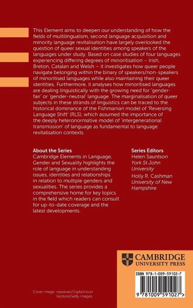 This Element aims to deepen our understanding of how the fields of multilingualism, second language acquisition and minority language revitalisation have largely overlooked the question of queer sexual identities among speakers of the languages under study. Based on case studies of four languages experiencing differing degrees of minoritisation - Irish, Breton, Catalan and Welsh - it investigates how queer people navigate belonging within the binary of speakers/non-speakers of minoritised languages while also maintaining their queer identities. Furthermore, it analyses how minoritised languages are dealing linguistically with the growing need for 'gender-fair' or 'gender-neutral' language. The marginalisation of queer subjects in these strands of linguistics can be traced to the historical dominance of the Fishmanian model of 'Reversing Language Shift' (RLS), which assumed the importance of the deeply heteronormative model of 'intergenerational transmission' of language as fundamental to language revitalisation contexts.