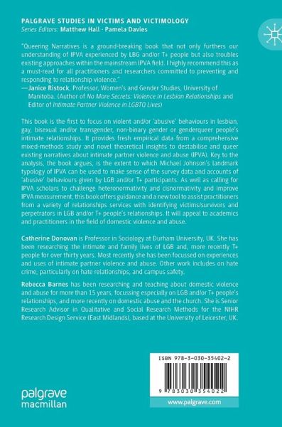 This book is the first to focus on violent and/or 'abusive' behaviours in lesbian, gay, bisexual and/or transgender, non-binary gender or genderqueer people's intimate relationships. It provides fresh empirical data from a comprehensive mixed-methods study and novel theoretical insights to destabilise and queer existing narratives about intimate partner violence and abuse (IPVA). Key to the analysis, the book argues, is the extent to which Michael Johnson's landmark typology of IPVA can be used to make sense of the survey data and accounts of 'abusive' behaviours given by LGB and/or T+ participants. As well as calling for IPVA scholars to challenge heteronormativity and cisnormativity and improve IPVA measurement, this book offers guidance and a new tool to assist practitioners from a variety of relationships services with identifying victims/survivors and perpetrators in LGB and/or T+ people's relationships. It will appeal to academics and practitioners in the field of domestic violence and abuse.