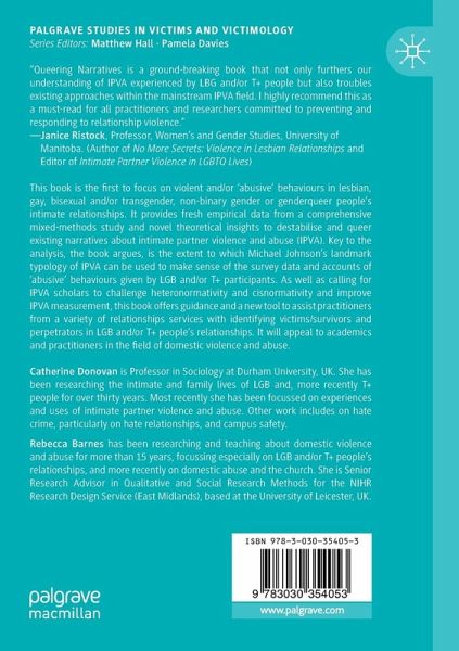 This book is the first to focus on violent and/or 'abusive' behaviours in lesbian, gay, bisexual and/or transgender, non-binary gender or genderqueer people's intimate relationships. It provides fresh empirical data from a comprehensive mixed-methods study and novel theoretical insights to destabilise and queer existing narratives about intimate partner violence and abuse (IPVA). Key to the analysis, the book argues, is the extent to which Michael Johnson's landmark typology of IPVA can be used to make sense of the survey data and accounts of 'abusive' behaviours given by LGB and/or T+ participants. As well as calling for IPVA scholars to challenge heteronormativity and cisnormativity and improve IPVA measurement, this book offers guidance and a new tool to assist practitioners from a variety of relationships services with identifying victims/survivors and perpetrators in LGB and/or T+ people's relationships. It will appeal to academics and practitioners in the field of domestic violence and abuse.