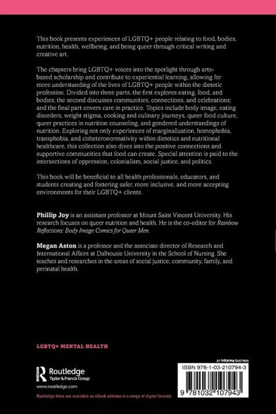 This book presents experiences of LGBTQ+ people relating to food, bodies, nutrition, health, wellbeing and being queer through critical writing and creative art.