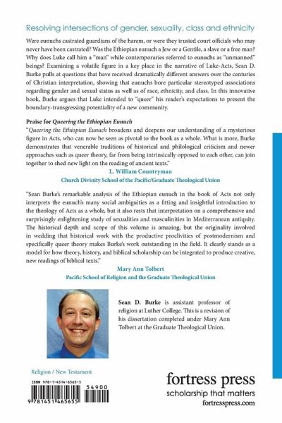 Sean D. Burke shows that eunuchs bore particular stereotyped associations regarding gender and sexual status as well as of race, ethnicity, and class. Not only has Luke failed to resolve these ambiguities; he has positioned this destabilized figure at a key place in the narrativeas the gospel has expanded beyond Judea, but before Gentiles are explicitly namedin such a way as to blur a number of social role boundaries. In this sense, Burke argues, Luke intended to queer his readers expectations and so to present the boundary-transgressing potentiality of a new community.