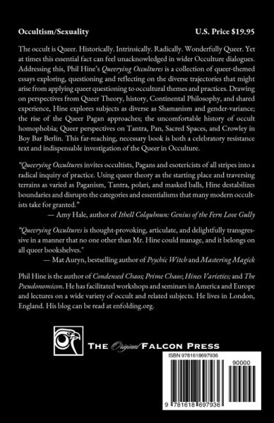 What is Queerying Occultures? 'Queerying' is a portmanteau word from 'Queer' and 'Query'-classic Phil Hine word play. Occulture is another portmanteau word meaning 'Hidden Culture' (from 'Occult' and 'Culture'). The occult is Queer. Historically. Intrinsically. Radically. Wonderfully Queer. Yet at times this essential fact can feel unacknowledged in wider Occulture dialogues. Addressing this, Phil Hine's Queerying Occultures is a collection of queer-themed essays exploring, questioning and reflecting on the diverse trajectories that might arise from applying queer questioning to occultural themes and practices. Drawing on perspectives from Queer Theory, history, Continental Philosophy, and shared experience, Hine explores subjects as diverse as Shamanism and gender-variance; the rise of the Queer Pagan approaches; the uncomfortable history of occult homophobia; Queer perspectives on Tantra, Pan, Sacred Spaces, and Crowley in Boy Bar Berlin. This far-reaching, necessary book is both a celebratory resistance text and indispensable investigation of the Queer in Occulture.