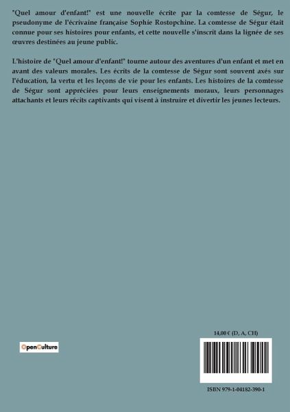 Texte à corriger : "Quel amour d'enfant!" de la Comtesse de Ségur est un récit évolutif qui explore les aventures et mésaventures de Giselle, une jeune fille dont le parcours est parsemé de défis et de changements. Le livre s'ouvre sur une description de Giselle, présentée comme un ange, mais dont la sincérité et le comportement sont rapidement mis à l'épreuve. À travers les chapitres, Giselle traverse diverses expériences qui mettent en lumière son courage, sa sévérité, et ses moments de rébellion. Les relations avec Léontine, une autre protagoniste, ajoutent une dimension de rivalité et de complicité à l'histoire. Les chapitres suivants dévoilent les conséquences des actions de Giselle, notamment ses punitions et réconciliations, ainsi que ses rechutes dans des comportements indisciplinés. Mme de Monclair, une figure d'autorité, joue un rôle clé dans la tentative de guider Giselle vers un chemin plus vertueux. La narration aborde également des thèmes de rédemption et de maturité, illustrés par le désir de Giselle d'entrer au couvent, sa lutte intérieure, et sa victoire personnelle. Le récit culmine avec les choix de vie de Giselle, son mariage, et les conséquences de ses décisions, qui la mènent à une situation de ruine et de repentir. Finalement, purifiée par ses larmes, Giselle parvient à une conclusion qui symbolise son évolution et sa rédemption. Ce livre, riche en leçons de vie, met en exergue la complexité des émotions humaines et la capacité de changement et de croissance personnelle.