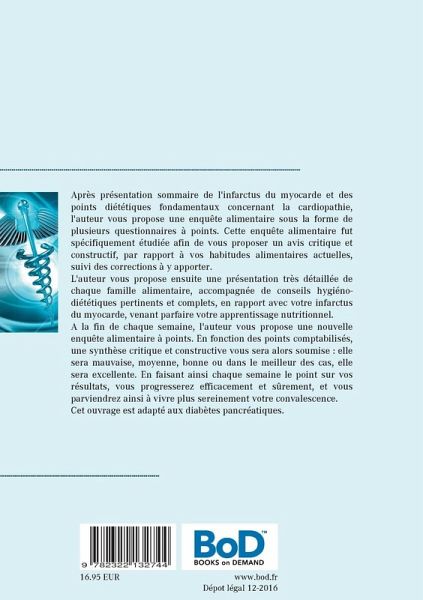 Comment se présente cet ouvrage ?1- Nous commencerons par une enquête alimentaire.Cette enquête alimentaire sous forme de questionnaires, sera partagée en trois tableaux à points : le premier concernera votre petit-déjeuner, le deuxième votre déjeuner, le dernier vous interrogera sur votre dîner. Bien entendu, celle-ci est spécifiquement étudiée, afin de me permettre de vous fournir un avis critique et constructif sur vos habitudes alimentaires en rapport avec votre infarctus du myocarde.En fonction des points obtenus au sein de chaque repas, je vous proposerai un avis nutritionnel constructif et critique, en relation avec vos habitudes alimentaires actuelles.Notre premier travail aura donc pour but de vous permettre de prendre conscience de vos erreurs alimentaires, suivi d'une correction de vos erreurs nutritionnelles.2- Je vous présenterai chaque famille alimentaire.Il s'agira de vous familiariser avec toutes les familles alimentaires, de vous permettre de bien appréhender l'importance de chacune d'entre elles, afin de mieux gérer sur le plan nutritionnel les suites à donner à votre infarctus du myocarde.De nombreux conseils hygiéno-diététiques vous seront proposés, vous aidant ensuite à faire les meilleurs choix.3- Place à la pratique !Ce troisième chapitre concernera la diététique pure.En effet, dans la première partie de ce chapitre, je vous proposerai l'élaboration de six jours de menus très détaillés, concernant votre petit-déjeuner, déjeuner et dîner. Cette partie ayant pour but l'apprentissage de vos nouvelles habitudes alimentaires, adaptées à votre infarctus du myocarde.Dans la deuxième partie, je vous proposerai trois semaines de menus adaptées à votre cardiopathie. Ces trois semaines de menus viendront illustrer et clore votre apprentissage nutritionnel.4- Les bilans diététiques hebdomadaires.A la fin de chaque semaine, je vous proposerai une nouvelle enquête alimentaire à points.En fonction des points hebdomadaires obtenus, une synthèse critique et constructive vous sera soumise : elle sera mauvaise, moyenne, bonne ou elle sera excellente.Cette synthèse hebdomadaire vous aidera à progresser efficacement et intelligemment, dans votre apprentissage nutritionnel imposé par votre infarctus du myocarde : le but étant de toujours s'améliorer, semaine après semaine.En faisant ainsi régulièrement le point sur vos résultats, vous progresserez efficacement et sûrement !