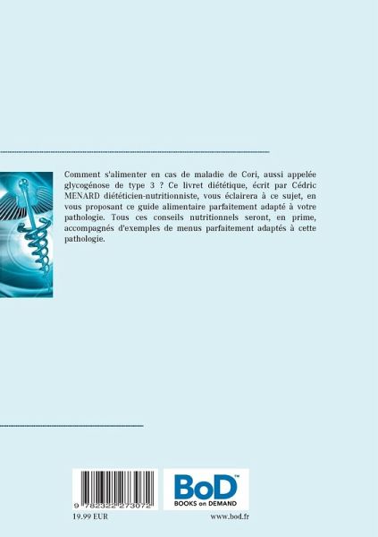 Comment s'alimenter en cas de maladie de Cori, aussi appelée glycogénose de type 3 ? Ce livret diététique, écrit par Cédric MENARD diététicien-nutritionniste, vous éclairera à ce sujet, en vous proposant ce guide alimentaire parfaitement adapté à votre pathologie. Tous ces conseils nutritionnels seront, en prime, accompagnés d'exemples de menus parfaitement adaptés à cette pathologie.