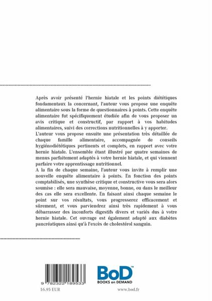 Après avoir présenté l'hernie hiatale et les points diététiques fondamentaux la concernant, l'auteur vous propose une enquête alimentaire sous la forme de questionnaires à points. Cette enquête alimentaire fut spécifiquement étudiée afin de vous proposer un avis critique et constructif, par rapport à vos habitudes alimentaires, suivi des corrections nutritionnelles à y apporter. L'auteur vous propose ensuite une présentation très détaillée de chaque famille alimentaire, accompagnée de conseils hygiénodiététiques pertinents et complets, en rapport avec votre hernie hiatale. L'ensemble étant illustré par quatre semaines de menus parfaitement adaptés à votre hernie hiatale, et qui viennent parfaire votre apprentissage nutritionnel. A la fin de chaque semaine, l'auteur vous invite à remplir une nouvelle enquête alimentaire à points. En fonction des points comptabilisés, une synthèse critique et constructive vous sera alors soumise : elle sera mauvaise, moyenne, bonne, ou dans le meilleur des cas elle sera excellente. En faisant ainsi chaque semaine le point sur vos résultats, vous progresserez efficacement et sûrement, et vous parviendrez ainsi très rapidement à vous débarrasser des inconforts digestifs divers et variés dus à votre hernie hiatale. Cet ouvrage est également adapté aux diabètes pancréatiques ainsi qu'à l'excès de cholestérol sanguin.