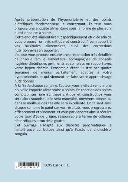 Comment se présente cet ouvrage ?1- Nous commencerons par une enquête alimentaire.Cette enquête alimentaire sous forme de questionnaires, sera partagée en trois tableaux à points : le premier concernera votre petit-déjeuner, le deuxième votre déjeuner, le dernier vous interrogera sur votre dîner. Bien entendu, celle-ci est spécifiquement étudiée, afin de me permettre de vous fournir un avis critique et constructif sur vos habitudes alimentaires en rapport avec votre hyperuricémie.En fonction des points obtenus au sein de chaque repas, je vous proposerai un avis nutritionnel constructif et critique, en relation avec vos habitudes alimentaires actuelles.Notre premier travail aura donc pour but de vous permettre de prendre conscience de vos erreurs alimentaires, suivi d'une correction de vos erreurs nutritionnelles.2- Je vous présenterai chaque famille alimentaire.Il s'agira de vous familiariser avec toutes les familles alimentaires, de vous permettre de bien appréhender l'importance de chacune d'entre elles, afin de mieux gérer sur le plan nutritionnel le traitement diététique de votre hyperuricémie.De nombreux conseils hygiéno-diététiques vous seront proposés, vous aidant ensuite à faire les meilleurs choix.3- Place à la pratique !Ce troisième chapitre concernera la diététique pure.En effet, dans la première partie de ce chapitre, je vous proposerai l'élaboration de six jours de menus très détaillés concernant votre petit-déjeuner, déjeuner et dîner. Cette partie ayant pour but l'apprentissage de vos nouvelles habitudes alimentaires, adaptées à votre hyperuricémie.Dans la deuxième partie, je vous proposerai trois semaines de menus adaptées à votre hyperuricémie. Ces trois semaines de menus viendront illustrer et clore votre apprentissage nutritionnel.4- Les bilans diététiques hebdomadaires.A la fin de chaque semaine, je vous proposerai une nouvelle enquête alimentaire à points.En fonction des points hebdomadaires obtenus, une synthèse critique et constructive vous sera alors soumise : elle sera mauvaise, moyenne, bonne ou elle sera excellente.Cette synthèse hebdomadaire vous aidera à progresser efficacement et intelligemment, dans votre apprentissage nutritionnel imposé par votre hyperuricémie : le but étant de toujours s'améliorer, semaine après semaine.En faisant ainsi régulièrement le point sur vos résultats, vous progresserez efficacement et sûrement !