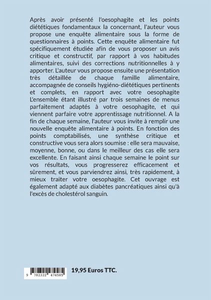Après avoir présenté l'oesophagite et les points diététiques fondamentaux la concernant, l'auteur vous propose une enquête alimentaire sous la forme de questionnaires à points. Cette enquête alimentaire fut spécifiquement étudiée afin de vous proposer un avis critique et constructif, par rapport à vos habitudes alimentaires, suivi des corrections nutritionnelles à y apporter. L'auteur vous propose ensuite une présentation très détaillée de chaque famille alimentaire, accompagnée de conseils hygiéno-diététiques pertinents et complets, en rapport avec votre oesophagite L'ensemble étant illustré par trois semaines de menus parfaitement adaptés à votre oesophagite, et qui viennent parfaire votre apprentissage nutritionnel. A la fin de chaque semaine, l'auteur vous invite à remplir une nouvelle enquête alimentaire à points. En fonction des points comptabilisés, une synthèse critique et constructive vous sera alors soumise : elle sera mauvaise, moyenne, bonne, ou dans le meilleur des cas elle sera excellente. En faisant ainsi chaque semaine le point sur vos résultats, vous progresserez efficacement et sûrement, et vous parviendrez ainsi, très rapidement, à mieux traiter votre oesophagite. Cet ouvrage est également adapté aux diabètes pancréatiques ainsi qu'à l'excès de cholestérol sanguin.