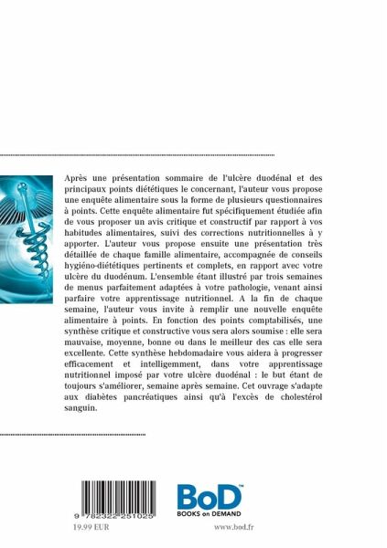 Après une présentation sommaire de l'ulcère duodénal et des principaux points diététiques le concernant, l'auteur vous propose une enquête alimentaire sous la forme de plusieurs questionnaires à points. Cette enquête alimentaire fut spécifiquement étudiée afin de vous proposer un avis critique et constructif par rapport à vos habitudes alimentaires, suivi des corrections nutritionnelles à y apporter. L'auteur vous propose ensuite une présentation très détaillée de chaque famille alimentaire, accompagnée de conseils hygiéno-diététiques pertinents et complets, en rapport avec votre ulcère du duodénum. L'ensemble étant illustré par trois semaines de menus parfaitement adaptées à votre pathologie, venant ainsi parfaire votre apprentissage nutritionnel. A la fin de chaque semaine, l'auteur vous invite à remplir une nouvelle enquête alimentaire à points. En fonction des points comptabilisés, une synthèse critique et constructive vous sera alors soumise : elle sera mauvaise, moyenne, bonne ou dans le meilleur des cas elle sera excellente. Cette synthèse hebdomadaire vous aidera à progresser efficacement et intelligemment, dans votre apprentissage nutritionnel imposé par votre ulcère duodénal : le but étant de toujours s'améliorer, semaine après semaine. Cet ouvrage s'adapte aux diabètes pancréatiques ainsi qu'à l'excès de cholestérol sanguin.