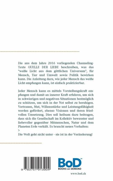 Die aus dem Jahre 2016 stammenden Channeling-Texte QUELLE DER LIEBE beschreiben, was das "weisse Licht aus dem göttlichen Universum", für Mensch, Tier und Umwelt sowie Politik bewirken kann. Die Anleitung dazu, wie jeder Mensch das weisse Licht empfangen kann, ist einfach praktizierbar.Jeder Mensch kann es mittels Vorstellungskraft empfangen und an innerer Kraft erfahren, um sich in schwierigen und negativen Situationen bestmöglich zu schützen, um sich in der Not selbst zu beruhigen. Vertrauen, Mut, Willensstärke und Leistungsfähigkeit werden gefördert, ebenso Visionen und deren friedvollen Umsetzung. Dies soll heilsam dazu beitragen, dass sich die Gesellschaft im Kollektiv bewusster und liebevoller gegenüber Mitmenschen, Natur und dem Planeten Erde verhält. Es braucht neues Verhalten:Die Welt geht nicht unter - sie ist in der Veränderung!