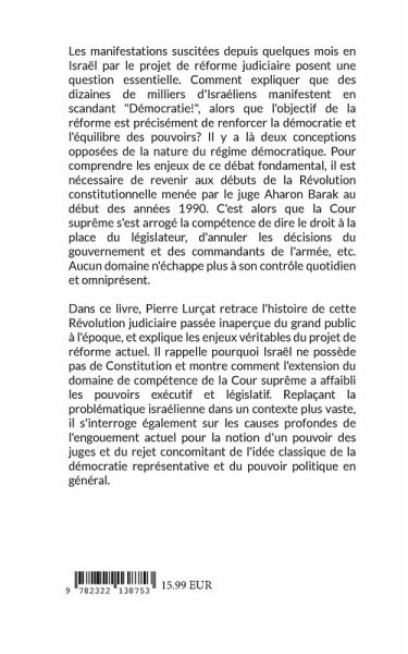Les manifestations suscitées depuis quelques mois en Israël par le projet de réforme judiciaire posent une question essentielle. Comment expliquer que des dizaines de milliers d'Israéliens manifestent en scandant "Démocratie!", alors que l'objectif de la réforme est précisément de renforcer la démocratie et l'équilivre des pouvoirs? Il y a là deux conceptions opposées de la nature du régime démocratique. Pour comprendre les enjeux de ce débat fondamental, il est nécessaire de revenir aux débuts de la Révolution constitutionnelle menée par le juge Aharon Barak au début des années 1990. C'est alors que la Cour suprême s'est arrogé la compétence de dire le droit à la place du législateur, d'annuler les décisions du gouvernement et des commandants de l'armée, etc. Aucun domaine n'échappe plus à son contrôle quotidien et omniprésent.Dans ce livre, Pierre Lurçat retrace l'histoire de cette Révolution judiciaire passée inaperçue du grand public à l'époque, et explique les enjeux véritables du projet de réforme actuel. Il rappelle pourquoi Israël ne possède pas de Constitution et montre comment l'extension du domaine de compétence de la Cour suprême a affaibli les pouvoirs exécutif et législatif. Replaçant la problématique israélienne dans un contexte plus vaste, il s'interroge également sur les causes profondes de l'engouement actuel pour la notion d'un pouvoir des juges et du rejet concomitant de l'idée classique de la démocratie représentative et du pouvoir politique en général.
