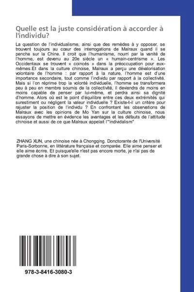 La question de l'individualisme, ainsi que des remèdes à y opposer, se trouvent toujours au coeur des interrogations de Malraux quand il se penche sur la Chine. Il croit que l'humanisme, nourri par la vanité de l'homme, est devenu au 20e siècle un " humain-centrisme ". Les Occidentaux se trouvent " coincés " dans la préoccupation pour eux-mêmes.Et dans la culture chinoise, Malraux a perçu une dévalorisation volontaire de l'homme : par rapport à la nature, l'homme est d'une importance secondaire, tout comme l'individu par rapport à la collectivité. Mais si l'on réprime trop la volonté individuelle, l'homme se transformera peu à peu en membre soumis de la collectivité, il deviendra de moins en moins capable de penser par lui-même, et perdra ainsi sa dignité d'homme. Alors où est le point d'équilibre entre ces deux extrémités qui surestiment ou négligent la valeur individuelle ? Existe-t-il un critère pour rajuster la position de l'individu ? En confrontant les observations de Malraux avec les opinions de Mo Yan sur la culture chinoise, nous essayons de mettre en évidence les avantages et les défauts de l'attitude chinoise et aussi de ce que Malraux appelait l'"individalism"