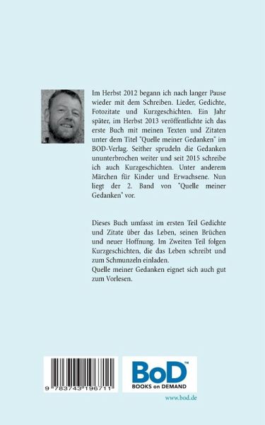 Im Herbst 2012 begann ich nach langer Pause wieder mit dem Schreiben. Lieder, Gedichte, Fotozitate und Kurzgeschichten. Ein Jahr später, im Herbst 2013 veröffentlichte ich das erste Buch mit meinen Texten und Zitaten unter dem Titel "Quelle meiner Gedanken" im BOD-Verlag. Seither sprudeln die Gedanken ununterbrochen weiter und seit 2015 schreibe ich auch Kurzgeschichten. Unter anderem Märchen für Kinder und Erwachsene. Nun liegt der 2. Band von "Quelle meiner Gedanken" vor. Dieses Buch umfasst im ersten Teil Gedichte und Zitate, über das Leben, seinen Brüchen und neuer Hoffnung. Im Zweiten Teil folgen Kurzgeschichten, die das Leben schreibt und zum Schmunzeln einladen. Die Schwarzweißfotos in diesem Buch sind Momentaufnahmen und ergänzen, bzw. erweitern die Texte in diesem Buch.Jörn Schimmelmann