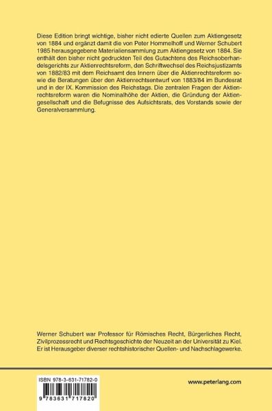 Diese Edition bringt wichtige, bisher nicht edierte Quellen zum Aktiengesetz von 1884 und ergänzt damit die von Peter Hommelhoff und Werner Schubert 1985 herausgegebene Materialiensammlung zum Aktiengesetz von 1884. Sie enthält den bisher nicht gedruckten Teil des Gutachtens des Reichsoberhandelsgerichts zur Aktienrechtsreform, den Schriftwechsel des Reichsjustizamts von 1882/83 mit dem Reichsamt des Innern über die Aktienrechtsreform sowie die Beratungen über den Aktienrechtsentwurf von 1883/84 im Bundesrat und in der IX. Kommission des Reichstags. Die zentralen Fragen der Aktienrechtsreform waren die Nominalhöhe der Aktien, die Gründung der Aktiengesellschaft und die Befugnisse des Aufsichtsrats, des Vorstands sowie der Generalversammlung.
