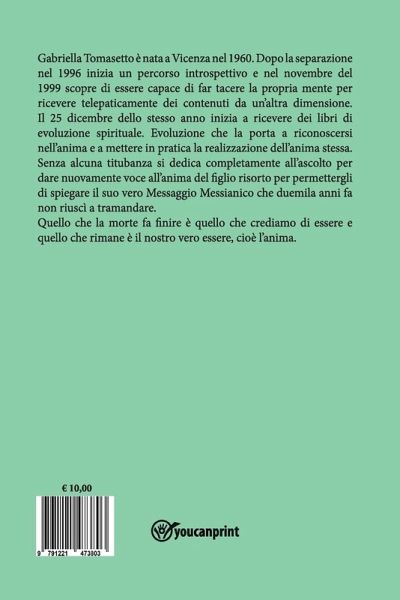 Gabriella Tomasetto è nata a Vicenza nel 1960. Dopo la separazione nel 1996 inizia un percorso introspettivo e nel novembre del 1999 scopre di essere capace di far tacere la propria mente per ricevere telepaticamente dei contenuti da un'altra dimensione. Il 25 dicembre dello stesso anno inizia a ricevere dei libri di evoluzione spirituale. Evoluzione che la porta a riconoscersi nell'anima e a mettere in pratica la realizzazione dell'anima stessa. Senza alcuna titubanza si dedica completamente all'ascolto per dare nuovamente voce all'anima del figlio risorto per permettergli di spiegare il suo vero Messaggio Messianico che duemila anni fa non riuscì a tramandare. Quello che la morte fa finire è quello che crediamo di essere e quello che rimane è il nostro vero essere, cioè l'anima.