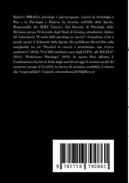 L'autore Roberto Sbrana, psicologo e psicoterapeuta, affronta il Cambiamento sociale in Italia dagli anni 60 ad oggi, le tensioni sociali del momento, l'attualità, il Covid19,.... Promotore della ricerca di un'antica sensibilità e di un ritrovato senso di responsabilità.