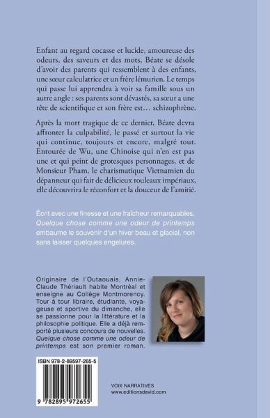 Enfant au regard cocasse et lucide, amoureuse des odeurs, des saveurs et des mots, Béate se désole d'avoir des parents qui ressemblent à des enfants, une sœur calculatrice et un frère lémurien. Le temps qui passe lui apprendra à voir sa famille sous un autre angle : ses parents sont dévastés, sa sœur a une tête de scientifique et son frère est… schizophrène. Après la mort tragique de ce dernier, Béatrice devra affronter la culpabilité, le passé et surtout la vie qui continue, toujours et encore, malgré tout. Entourée de Wu, une Chinoise qui n'en est pas une et qui peint de grotesques personnages, et de Monsieur Pham, le charismatique Vietnamien du dépanneur qui fait de délicieux rouleaux impériaux, elle découvrira le réconfort et la douceur de l'amitié. Écrit avec une finesse et une fraîcheur remarquables, Quelque chose comme une odeur de printemps embaume le souvenir d'un hiver beau et glacial, non sans laisser quelques engelures.