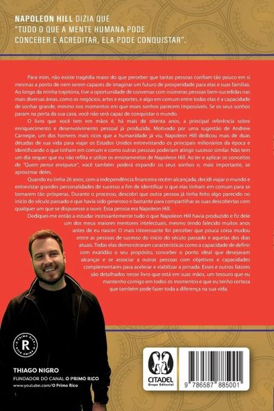 Quem Pensa Enriquece é baseado no resultado de mais de 20 anos de estudo e análise de indivíduos que acumularam fortunas pessoais. Napoleon Hill estudou os hábitos de 16 mil pessoas, entre elas 500 milionários e os homens mais ricos de sua época, e chegou às ¿leis¿ que devem ser aplicadas para a conquista do sucesso. Quem Pensa Enriquece condensa essas leis dando a você os 13 princípios na forma da ¿Filosofia da Conquistä. Mark Hansen, disse que o tempo mostrou que duas das leis/princípios possuem especial importância: 1) O princípio da Mastermind (Mente Mestra) e 2) A necessidade de um Objetivo Definido. O livro afirma que desejo, unido à fé e à persistência, pode levar o indivíduo a realizar qualquer feito, desde que este possa se livrar de pensamentos negativos e manter o foco em seu objetivo.