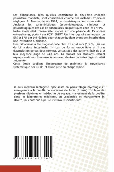 Les bilharzioses, bien qu'elles constituent la deuxième endémie parasitaire mondiale, sont considérées comme des maladies tropicales négligées. En Tunisie, depuis 1984, on n'assiste qu'à des cas importés. Analyser les caractéristiques épidémiologiques, cliniques et parasitologiques des cas de bilharzioses diagnostiqués chez les ENRPT. Notre étude était transversale, menée sur une période de 15 années universitaires, portant sur 6051 ENRPT. Un interrogatoire minutieux, un EPS et EPU ont été réalisés pour chaque étudiant avant de s'inscrire dans une institution tunisienne. Une bilharziose a été diagnostiquée chez 91 étudiants (1,5 %) (76 cas de bilharziose intestinale, 14 cas de forme urogénitale et 1 cas d'association de ces deux formes). Le sex-ratio des patients était de 3 et leur moyenne d'âge de 24,4 ans. La plupart des étudiants étaient asymptomatiques. Une association avec d'autres parasites digestifs était fréquente.Cette étude souligne l'importance de maintenir la surveillance systématique des ENRPT et d'une prise en charge rapide.