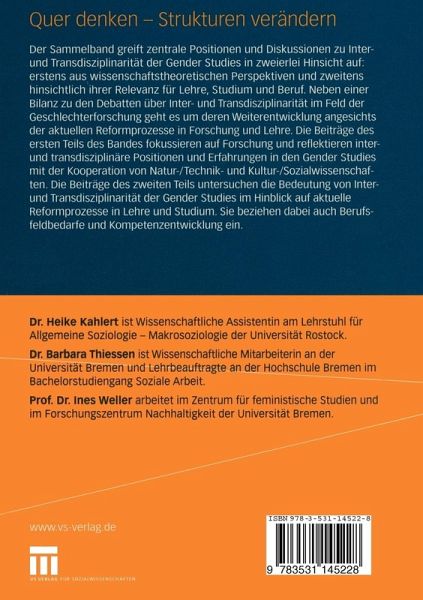 Der Sammelband greift zentrale Positionen und Diskussionen zu Inter- und Transdisziplinarität der Gender Studies in zweierlei Hinsicht auf: erstens aus wissenschaftstheoretischen Perspektiven und zweitens hinsichtlich ihrer Relevanz für Lehre, Studium und Beruf. Neben einer Bilanz zu den Debatten über Inter- und Transdisziplinarität im Feld der Geschlechterforschung geht es um deren Weiterentwicklung angesichts der aktuellen Reformprozesse in Forschung und Lehre. Die Beiträge des ersten Teils fokussieren auf Forschung und reflektieren inter- und transdisziplinäre Positionen und Erfahrungen in den Gender Studies mit der Kooperation von Natur-/Technik- und Kultur-/Sozialwissenschaften. Die Beiträge des zweiten Teils untersuchen die Bedeutung von Inter- und Transdisziplinarität der Gender Studies im Hinblickauf aktuelle Reformprozesse in Lehre und Studium.