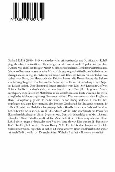 Gerhard Rohlfs (1831-1896) war ein deutscher Afrikareisender und Schriftsteller. Rohlfs ging als offiziell unterstützter Forschungsreisender erneut nach Tripolis, um von dort (Abreise Mai 1865) das Hoggar-Massiv zu erforschen und nach Timbuktu weiterzuziehen. Schon in Ghadames musste er seine Marschrichtung wegen des feindlichen Verhaltens der Tuareg ändern. Er zog über Murzuk im Fessan und Bilma im Kaouar-Tal am Tschad-See vorbei nach Kuka, der Hauptstadt des Reiches Bornu. Mit Unterstützung des Sultans von Bornu gelangte er von dort an den Benue, den er bis zur Einmündung in den Niger bei Lokoja befuhr. Über Ilorin und Ibadan erreichte er im Mai 1867 Lagos am Golf von Guinea. Rohlfs hatte damit nicht nur als einer der ersten Europäer die gesamte Sahara durchquert, seine Reise vom Mittelmeer an die westafrikanische Küste wurde als die zweite europäische Afrikadurchquerung überhaupt gefeiert. Dies war zuvor nur dem Engländer David Livingstone geglückt. In Berlin wurde er von König Wilhelm I. von Preußen empfangen und zum Ehrenmitglied der Berliner Gesellschaft für Erdkunde ernannt. Er erhielt die goldenen Medaillen der geographischen Gesellschaften von Paris und London. Rohlfs beschreibt in seinem Werk "Quer durch Afrika" sehr anschaulich die Praxis des Sklavenhandels, dessen erklärter Gegner er war. Dennoch behandelte er in Murzuk einen erkrankten Sklavenhändler aus Kordofan. Aus Dank für seine Genesung schenkte dieser Rohlfs einen jungen Sklaven, der etwa 7 oder 8 Jahre alt war. Dies war am 25. Dezember 1865. Rohlfs gab ihm den Namen Henry Noël. Da Rohlfs den Jungen nicht allein zurücklassen wollte, begleitete er Rohlfs auf seiner weiteren Reise. Rohlfs nahm ihn später mit nach Berlin, wo ihn der Deutsche Kaiser Wilhelm I. auf seine Kosten erziehen ließ.
