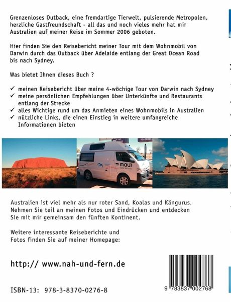 Grenzenloses Outback, eine fremdartige Tierwelt, pulsierende Metropolen, herzliche Gastfreundschaft - all das und noch vieles mehr hat mir Australien auf meiner Reise im Sommer 2006 geboten. Hier finden Sie den Reisebericht meiner Tour mit dem Wohnmobil von Darwin durch das Outback über Adelaide entlang der Great Ocean Road bis nach Sydney.Was bietet Ihnen dieses Buch ?- einen Reisebericht über meine 4-wöchige Tour von Darwin nach Sydney- meine persönlichen Empfehlungen über Unterkünfte und Restaurants entlang der Strecke- alles Wichtige rund um das Anmieten eines Wohnmobils in Australien- nützliche Links, die einen Einstieg in weitere umfangreiche Informationen bieten- ein Register von A - ZEntdecken Sie mit mir Australien. Australien ist viel mehr als nur roter Sand, Koalas und Kängurus."Australien ist wie eine offene Tür, hinter der ein tiefes Blau liegt. Man lässt die Welt hinter sich und betritt Australien." (D. H. Lawrence)
