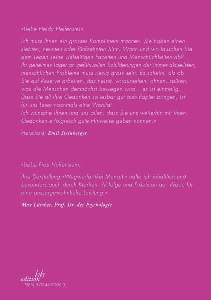 Querdenkereien über den Tod und die Liebe, den Schönheits-, Schlankheits- und Jugendwahn(sinn) bis zur Ethik in Medien und Alltags-Kommunikation werden in diesem Buch mal humorvoll, mal tiefgründig, aber immer leicht verständlich und mit sehr viel Herzblut und Leidenschaft auf den Punkt gebracht. Der Kabarettist Emil Steinberger schrieb dazu: "Sie haben einen siebten, neunten oder fünfzehnten Sinn. Wann und wo lauschen Sie dem Leben seine vielseitigen Facetten und Menschlichkeiten ab? Ihr geheimes Lager an gefühlvollen Schilderungen der immer aktuellsten menschlichen Probleme muss riesig gross sein. Es scheint, als ob Sie...voraussehen, ahnen, spüren, was die Menschen demnächst bewegen wird - es ist einmalig."