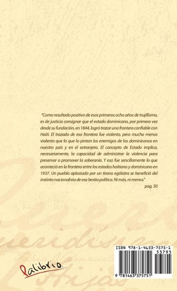"Como resultado positivo de esos primeros ocho años de trujillismo, es de justicia consignar que el estado dominicano, por primera vez desde su fundación, en 1844, logró trazar una frontera confiable con Haití. El trazado de esa frontera fue violento, pero mucho menos violento que lo que lo pintan los enemigos de los dominicanos en nuestro país y en el extranjero. El concepto de Estado implica, necesariamente, la capacidad de administrar la violencia para preservar o promover la soberanía. Y eso fue sencillamente lo que aconteció en la frontera entre los estados haitiano y dominicano en 1937. Un pueblo aplastado por un tirano ególatra se benefició del instinto nacionalista de esa bestia política. Ni más, ni menos." pag. 50