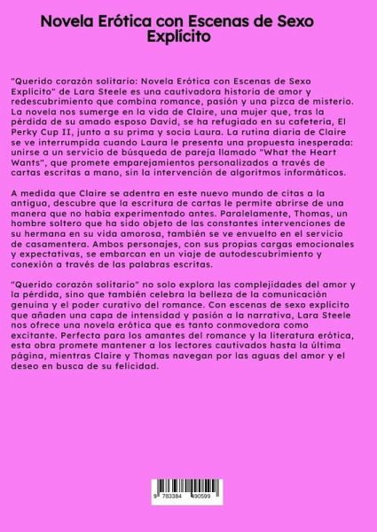 "Querido corazón solitario: Novela Erótica con Escenas de Sexo Explícito" de Lara Steele es una cautivadora historia de amor y redescubrimiento que combina romance, pasión y una pizca de misterio. La novela nos sumerge en la vida de Claire, una mujer que, tras la pérdida de su amado esposo David, se ha refugiado en su cafetería, El Perky Cup II, junto a su prima y socia Laura. La rutina diaria de Claire se ve interrumpida cuando Laura le presenta una propuesta inesperada: unirse a un servicio de búsqueda de pareja llamado "What the Heart Wants", que promete emparejamientos personalizados a través de cartas escritas a mano, sin la intervención de algoritmos informáticos.A medida que Claire se adentra en este nuevo mundo de citas a la antigua, descubre que la escritura de cartas le permite abrirse de una manera que no había experimentado antes. Paralelamente, Thomas, un hombre soltero que ha sido objeto de las constantes intervenciones de su hermana en su vida amorosa, también se ve envuelto en el servicio de casamentera. Ambos personajes, con sus propias cargas emocionales y expectativas, se embarcan en un viaje de autodescubrimiento y conexión a través de las palabras escritas."Querido corazón solitario" no solo explora las complejidades del amor y la pérdida, sino que también celebra la belleza de la comunicación genuina y el poder curativo del romance. Con escenas de sexo explícito que añaden una capa de intensidad y pasión a la narrativa, Lara Steele nos ofrece una novela erótica que es tanto conmovedora como excitante. Perfecta para los amantes del romance y la literatura erótica, esta obra promete mantener a los lectores cautivados hasta la última página, mientras Claire y Thomas navegan por las aguas del amor y el deseo en busca de su felicidad.