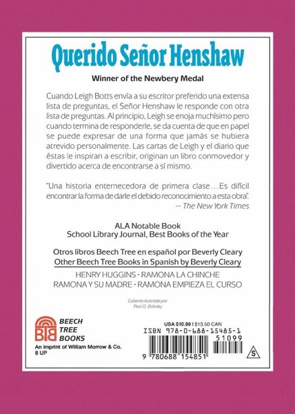 This high-quality Spanish-language book can be enjoyed by fluent Spanish speakers as well as those learning the language, whether at home or in a classroom. Este libro de Beverly Cleary que gano el Newbery Medal investiga los pensamientos y las emociones de un niño de sexto grado, Leigh Botts, en la forma de carta mientras el escribe a su escritor preferido, Boyd Henshaw. Después que su parientes se separan, Leigh Botts se mueve a una ciudad nueva con su madre. Esforzando a hacer amigos y enfrentarse con su propio ira por su padre ausente, Leigh se pierde en una tarea de escribir a su escritor preferido. Cuando Mr Henshaw le responde, los dos forman un amistad inesperada que cambia la vida de Leigh para siempre.
