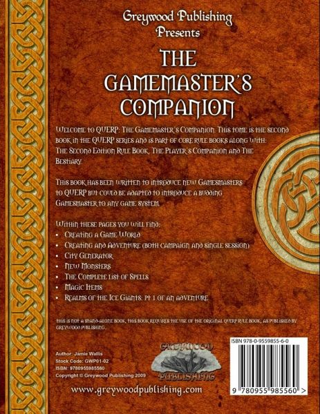Welcome to QUERP: The Gamemaster's Guide. This tome is the fifth book in the QUERP series and is part of core rule books along with: The Second Edition Rule Book, The Player's Companion and The Bestiary. This book has been written to introduce new Gamesmasters to QUERP but could be adapted to introduce a budding Gamesmaster to any game system. Within these pages you will find: ¿ Creating a Game World ¿ Creating and Adventure (both campaign and single session) ¿ City Generator ¿ New Monsters ¿ The Complete list of Spells ¿ Magic Items ¿ Realms of the Ice Giants: pt 1 of an adventure