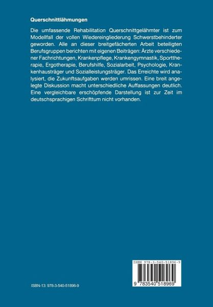 Die umfassende Rehabilitation Querschnittgelähmter ist zum Modellfall der vollen Wiedereingliererung Schwerstbehinder- ter geworden. Alle an dieser breitgefächerten Arbeit betei- ligten Berufsgruppen berichten mit eigenen Beiträgen: Òrzte verschiedener Fachrichtungen, Krankenpflege, Krankengymnas- tik, Sporttherapie, Ergotherapie, Berufshilfe, Sozialarbeit, Psychologie, Krankenhausträger und Sozialleitungsträger. Das Erreichte wird analysiert, die Zukunftsaufgaben werden umrissen. Eine breit angelegte Diskussion macht unterschied- liche Auffassungen deutlich. Eine vergleichbare erschöpfende Darstellung ist zur Zeit im deutschprachigen Schrifttum nicht vorhanden.