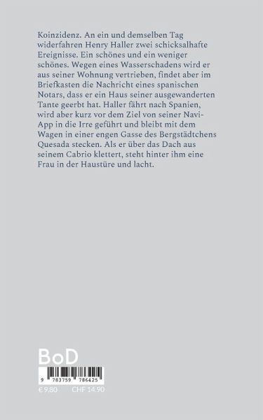 Koinzidenz. An ein und demselben Tag widerfahren Henry Haller zwei schicksalhafte Ereignisse. Ein schönes und ein weniger schönes. Wegen eines Wasserschadens wird er aus seiner Wohnung vertrieben, findet aber im Briefkasten die Nachricht eines spanischen Notars, dass er ein Haus seiner ausgewanderten Tante geerbt hat. Haller fährt nach Spanien, wird aber kurz vor dem Ziel von seiner Navi-App in die Irre geführt und bleibt mit dem Wagen in einer engen Gasse des Bergstädtchens Quesada stecken. Als er über das Dach aus seinem Cabrio klettert, steht hinter ihm eine Frau in der Haustüre und lacht.