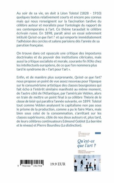 Au soir de sa vie, on doit à Léon Tolstoï (1828 - 1910) quelques textes relativement courts et encore peu connus mais qui nous renseignent sur la fascination tardive du célèbre auteur et moraliste pour l'ontologie du rapport de ses contemporains à l'art. Ce thème taraudait le célèbre écrivain russe. En 1898, paraît ainsi un essai sobrement intitulé Qu'est-ce que l'art ? et qui emporte immédiatement l'adhésion des cercles et salons parisiens dès l'année de sa parution française.On trouve dans cet opuscule une critique des impostures doctrinales et du pouvoir des institutions cléricales, mais aussi la critique socialiste et morale, courante fin XIXe chez les intellectuels européens, de ce que l'on nommera plus tard le syndrome de « l'art pour l'art ». Enfin, et de manière plus surprenante, Qu'est-ce que l'art? nous propose un point de vue assez nouveau pour l'époque sur le consumérisme artistique des classes bourgeoises qui fait écho à l'intérêt similaire manifesté au même moment, de l'autre côté de l'Atlantique, par l'américain Veblen, alors en train de mettre un point final à sa célèbre Théorie de la classe de loisir qui paraîtra l'année suivante, en 1899. Tolstoï tout comme Veblen analysent le capitalisme non pas sous le prisme de la production, comme a pu le faire Marx, mais bien sous celui de la consommation, s'arrêtant sur les classes supérieures, cible de nos deux auteurs et, plus tard, de leurs célèbres continuateurs Edmond Goblot (La barrière et le niveau) et Pierre Bourdieu (La distinction). On l'aura compris, cet essai méconnu de Léon Tolstoï ne mérite pas sa relégation au rang des oeuvres « mineures » de l'écrivain russe. L'art doit-il être « beau » ? Comment comprendre l'art sans croire en la beauté ? Comment formuler une théorie de l'art dans classer les publics qui s'y adonnent? Présenté lors de sa rééditions aux PUF comme un « texte précurseur de l'esthétique moderne », Qu'est-ce que l'art ? pose, plus d'un siècle après sa parution, des questions de perception artistique qui restent d'une vibrante actualité.
