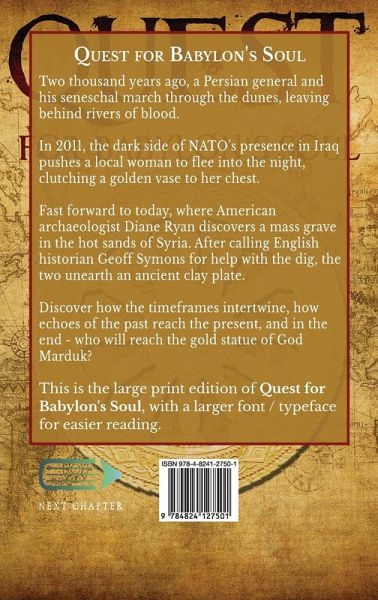Two thousand years ago, a Persian general and his seneschal march through the dunes, leaving behind rivers of blood. In 2011, the dark side of NATO's presence in Iraq pushes a local woman to flee into the night, clutching a golden vase to her chest. Fast forward to today, where American archaeologist Diane Ryan discovers a mass grave in the hot sands of Syria. After calling English historian Geoff Symons for help with the dig, the two unearth an ancient clay plate. Discover how the timeframes intertwine, how echoes of the past reach the present, and in the end - who will reach the gold statue of God Marduk? This is the large print edition of Quest for Babylon's Soul, with a larger font / typeface for easier reading.