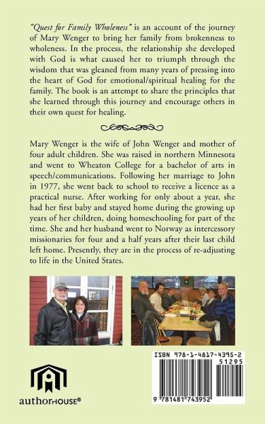 "Quest for Family Wholeness" is an account of the journey of Mary Wenger to bring her family from brokenness to wholeness. In the process, the relationship she developed with God is what caused her to triumph through the wisdom that was gleaned from many years of pressing into the heart of God for emotional/spiritual healing for the family. The book is an attempt to share the principles that she learned through this journey and encourage others in their own quests for healing.
