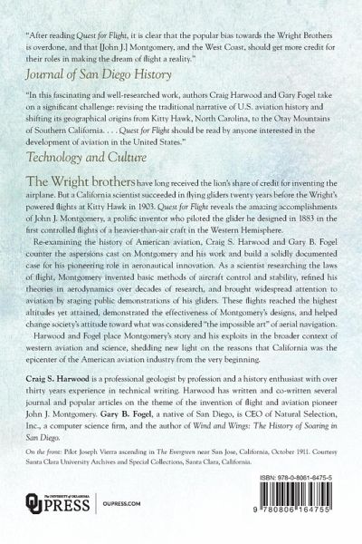 The Wright brothers have long received the lion's share of credit for inventing the airplane. But a California scientist succeeded in flying gliders twenty years before the Wright's powered flights at Kitty Hawk in 1903. Quest for Flight reveals the amazing accomplishments of John J. Montgomery, a prolific inventor who piloted the glider he designed in 1883 in the first controlled flights of a heavier-than-air craft in the Western Hemisphere. Re-examining the history of American aviation, Craig S. Harwood and Gary B. Fogel present the story of human efforts to take to the skies. They show that history's nearly exclusive focus on two brothers resulted from a lengthy public campaign the Wrights waged to profit from their aeroplane patent and create a monopoly in aviation. Countering the aspersions cast on Montgomery and his work, Harwood and Fogel build a solidly documented case for Montgomery's pioneering role in aeronautical innovation. As a scientist researching the laws of flight, Montgomery invented basic methods of aircraft control and stability, refined his theories in aerodynamics over decades of research, and brought widespread attention to aviation by staging public demonstrations of his gliders. After his first flights near San Diego in the 1880s, his pursuit continued through a series of glider designs. These experiments culminated in 1905 with controlled flights in Northern California using tandem-wing Montgomery gliders launched from balloons. These flights reached the highest altitudes yet attained, demonstrated the effectiveness of Montgomery's designs, and helped change society's attitude toward what was considered "the impossible art" of aerial navigation. Inventors and aviators working west of the Mississippi at the turn of the twentieth century have not received the recognition they deserve. Harwood and Fogel place Montgomery's story and his exploits in the broader context of western aviation and science, shedding new light on the reasons that California was the epicenter of the American aviation industry from the very beginning.