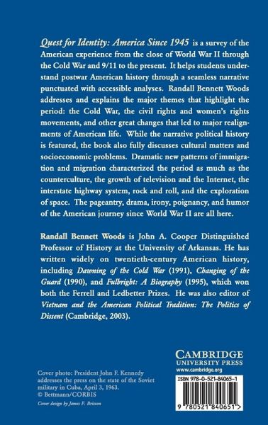 Quest for Identity is a survey of the American experience from the close of World War II, through the Cold War and 9/11, to the present. It helps students understand postwar American history through a seamless narrative punctuated with accessible analyses. Randall Woods addresses and explains the major themes that punctuate the period: the Cold War, the Civil Rights and Women's Rights movements, and other great changes that led to major realignments of American life. While political history is emphasized, Woods also discusses in equal measure cultural matters and socio-economic problems. Dramatic new patterns of immigration and migration characterized the period as much as the counterculture, the growth of television and the Internet, the interstate highway system, rock and roll, and the exploration of space. The pageantry, drama, irony, poignancy and humor of the American journey since World War II are all here.