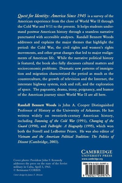Quest for Identity is a survey of the American experience from the close of World War II, through the Cold War and 9/11, to the present. It helps students understand postwar American history through a seamless narrative punctuated with accessible analyses. Randall Woods addresses and explains the major themes that punctuate the period: the Cold War, the Civil Rights and Women's Rights movements, and other great changes that led to major realignments of American life. While political history is emphasized, Woods also discusses in equal measure cultural matters and socio-economic problems. Dramatic new patterns of immigration and migration characterized the period as much as the counterculture, the growth of television and the Internet, the interstate highway system, rock and roll, and the exploration of space. The pageantry, drama, irony, poignancy and humor of the American journey since World War II are all here.