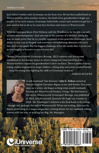 Jack Fisher's battles with Grimsnipe are far from over. He has been pulled back to Weaverworld to solve another mystery: the theft of his grandmother's Eagle-eye amulet. Is her arch-enemy, Grimsnipe, behind the crime? Jack resolves to get her a new amulet, but to do so he must face his fears and return to Weaverworld. With his loyal guardians, Peter Bellamy and Lily Windhover, by his side-as well as some uninvited guests-Jack sets out on the journey of a lifetime. Along the way, he must prove that he is a worthy opponent to the powerful Grimsnipe. Jack's ability to stay true to his goal and overcome overwhelming obstacles will serve him well on his quest. But the biggest challenge of his life awaits him. Can he rise to new heights of bravery to save his own life? "Rohan (Weaverworld: Grimsnipe's Revenge, 2012) returns with the second installment in her fantasy series, in which young Jack must travel back to Weaverworld to replace his grandmother's silver necklace. There's plenty to keep young readers engrossed as shape-shifters, a flying ship and action-packed battles … keep the young hero fighting the odds as Grimsnipe closes in." -KIRKUS REVIEWS