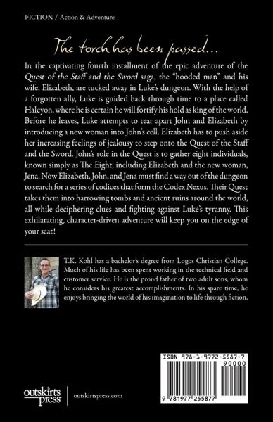 In the captivating fourth installment of the epic adventure of the Quest of the Staff and the Sword saga, the "hooded man" and his wife, Elizabeth, are tucked away in Luke's dungeon. With the help of a forgotten ally, Luke is guided back through time to a place called Halcyon, where he is certain he will fortify his hold as king of the world. Before he leaves, Luke attempts to tear apart John and Elizabeth by introducing a new woman into John's cell. Elizabeth has to push aside her increasing feelings of jealousy to step onto the Quest of the Staff and the Sword. John's role in the Quest is to gather eight individuals, known simply as The Eight, including Elizabeth and the new woman, Jena. Now Elizabeth, John, and Jena must find a way out of the dungeon to search for a series of codices that form the Codex Nexus. Their Quest takes them into harrowing tombs and ancient ruins around the world, all while deciphering clues and fighting against Luke's tyranny. This exhilarating, character-driven adventure will keep you on the edge of your seat!