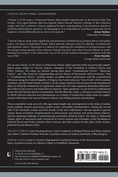 The second volume of The Quest to Understand Human Affairs presents thirty-six previously unpublished manuscripts written by Vincent Ostrom, cofounder of the Workshop in Political Theory and Policy Analysis. The essays are divided among three parts: Constitutional Choice, Epistemic Choice, and The Quest for Understanding and the Future of Democratic Self-Governance. Part I, Constitutional Choice, includes studies on public sector performance and the constitutional dilemmas facing the Federal Republic of Nigeria, the North American "New World" of US constitutionalism, and the United States of Mexico. In the essays of Part II, Ostrom turns to the foundational ideas on which the institutions of a particular culture rest. He raises questions about the methodologies of the social sciences and insists that we return to "basic questions" in our search for institutional forms that will liberate human communities. Part III offers the reader a colloquy on self-governance in which Ostrom’s speeches and presentations on a variety of twenty-first-century issues are supplemented with letters and memos between Ostrom and visiting scholars and students. These remarkable works not only offer specialists insight into developments in the fields of institutional analysis, resource governance, policy and administration—during the second half of the twentieth century and first decade of the new millennium—but also speak to general readers about worldwide transformations in democracies and human and environment relations as well as the enduring challenge of sustaining just, productive political orders. The Quest to Understand Human Affairs is introduced with a foreword by Nobel Laureate and co-founder of the Workshop in Political Theory and Policy Analysis, Elinor Ostrom, with a preface by the editor of the volume, political theorist Barbara Allen.