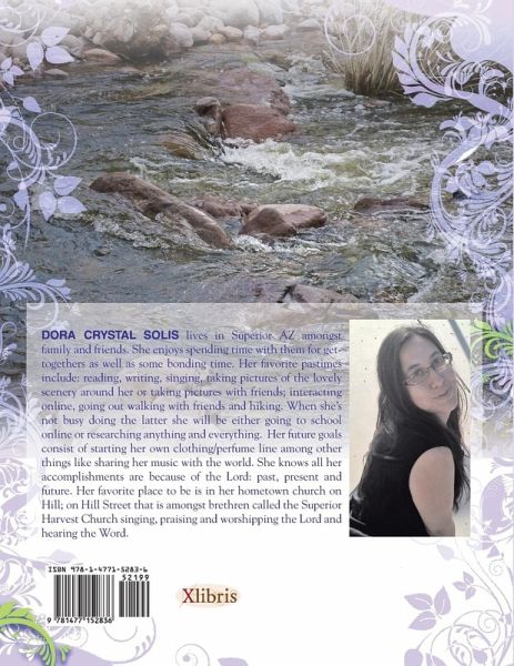 DORA CRYSTAL SOLIS lives in Superior AZ amongst family and friends. She enjoys spending time with them for gettogethers as well as some bonding time. Her favorite pastimes include: reading, writing, singing, taking pictures of the lovely scenery around her or taking pictures with friends; interacting online, going out walking with friends and hiking. When she's not busy doing the latter she will be either going to school online or researching anything and everything. Her future goals consist of starting her own clothing/perfume line among other things like sharing her music with the world. She knows all her accomplishments are because of the Lord: past, present and future. Her favorite place to be is in her hometown church on Hill; on Hill Street that is amongst brethren called the Superior Harvest Church singing, praising and worshipping the Lord and hearing the Word.