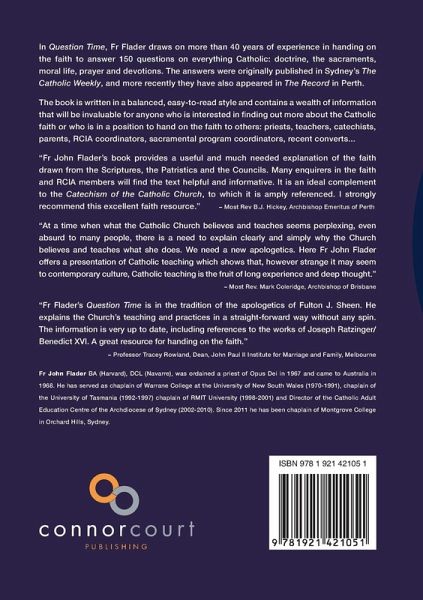 In Question Time, Fr Flader draws on more than 40 years of experience in handing on the faith to answer 150 questions on everything Catholic: doctrine, the sacraments, moral life, prayer and devotions. The answers were originally published in Sydney’s The Catholic Weekly, and more recently they have also appeared in The Record in Perth. The book is written in a balanced, easy-to-read style and contains a wealth of information that will be invaluable for anyone who is interested in finding out more about the Catholic faith or who is in a position to hand on the faith to others: priests, teachers, catechists, parents, RCIA coordinators, sacramental program coordinators, recent converts... "Fr John Flader’s book provides a useful and much-needed explanation of the faith drawn from the Scriptures, the Patristics and the Councils. Many enquirers in the faith and RCIA members will find the text helpful and informative. It is an ideal complement to the Catechism of the Catholic Church, to which it is amply referenced. I strongly recommend this excellent faith resource." – Most Rev B.J. Hickey, Archbishop Emeritus of Perth "At a time when what the Catholic Church believes and teaches seems perplexing, even absurd to many people, there is a need to explain clearly and simply why the Church believes and teaches what she does. We need a new apologetics. Here Fr John Flader offers a presentation of Catholic teaching which shows that, however strange it may seem to contemporary culture, Catholic teaching is the fruit of long experience and deep thought." – Most Rev. Mark Coleridge, Archbishop of Brisbane "Fr Flader’s Question Time is in the tradition of the apologetics of Fulton J. Sheen. He explains the Church’s teaching and practices in a straightforward way without any spin. The information is very up to date, including references to the works of Joseph Ratzinger/Benedict XVI. A great resource for handing on the faith." – Professor Tracey Rowland, Dean, John Paul II Institute for Marriage and Family Fr John Flader BA (Harvard), DCL (Navarre), was ordained a priest of Opus Dei in 1967 and came to Australia in 1968. He has served as chaplain of Warrane College at the University of New South Wales (1970-1991), chaplain of the University of Tasmania (1992-1997) chaplain of RMIT University (1998-2001) and Director of the Catholic Adult Education Centre of the Archdiocese of Sydney (2002-2010). Since 2011 he has been chaplain of Montgrove College in Orchard Hills, Sydney.