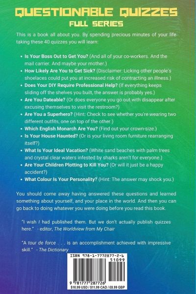 Questionable Quizzes Full Series - All 40 Quizzes This is a book all about you! In this quiz book parody, the sillier the question, the sillier the answer. By spending precious minutes of your life taking these forty funny quizzes you can find out: Are You a Superhero? (Hint: Check to see whether you're wearing two different outfits, one on top of the other.) How Likely Are You to Get Sick? (Disclaimer: Licking other people's shoelaces could increase your risk of contracting an illness.) Does Your DIY Require Professional Help? (If everything keeps sliding off the shelves you built, the answer is probably yes.) Which English Monarch Are You? (Find out your crown-size.) Is Your House Haunted? (Or is your living room furniture rearranging itself?) What Is Your Ideal Vacation? (White sand beaches, palm trees, and crystal clear waters infested with sharks aren't for everyone.) What Colour Is Your Personality? (Hint: The answer may shock you.) You are about to set off on your own personal journey of self-discovery - but first, some quizzes.